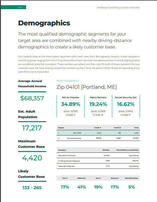 We focused on the downtown neighborhood in Portland where the arts district is located and the 15-minute drive surrounding it. The zip code is 04101 and it had a total of 4,420 of people that would likely be able to join a coworking space. The 15-minute area surrounding the neighborhood had a whooping 44,026 people. The likely coworking base for the neighborhood is 474 customers within the zip, but 2,614 within an easy drive. Since it's a downtown zip code it is safe to assume the 15-minute drive is a more accurate representation of the customer base